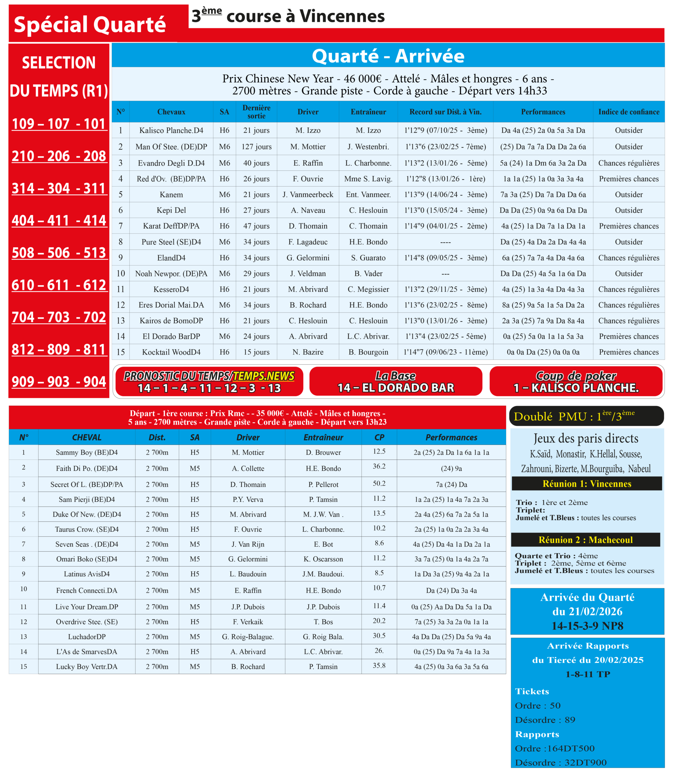 Notre spécial Quarté d’aujourd’hui, 3ème course à Vincennes, donne notre pronostic du Temps/ Temps News avec le cheval n°14 El Dorado Bar étant la base, tandis que le coup de poker est le cheval n°1 Kalisco Planche.