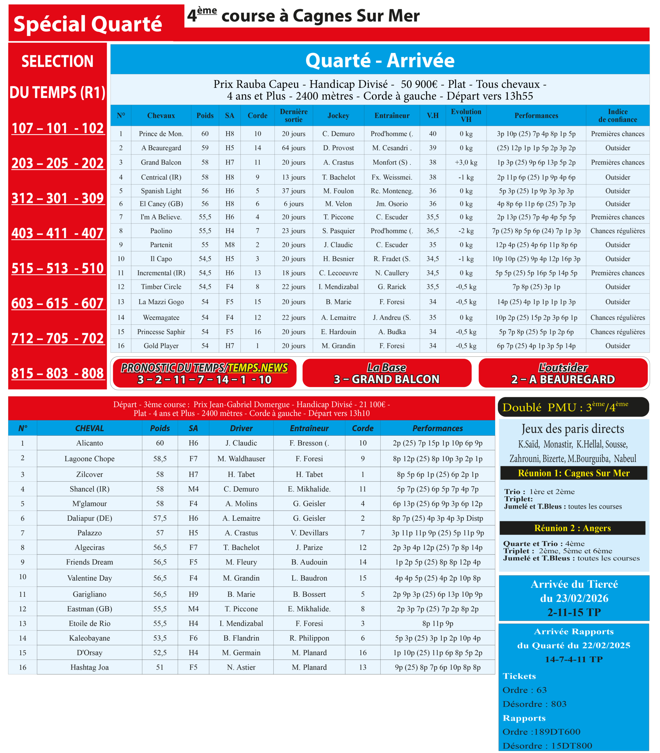 Partager Facebook Twitter LinkedIn Pinterest Email Notre spécial Quarté d’aujourd’hui, 4ème course à Cagnes Sur Mer, donne notre pronostic du Temps/ Temps News avec le cheval n°3 Grand Balcon étant la base, tandis que le coup de poker est le cheval n°2 A Beauregard. PMU Quinté Turf