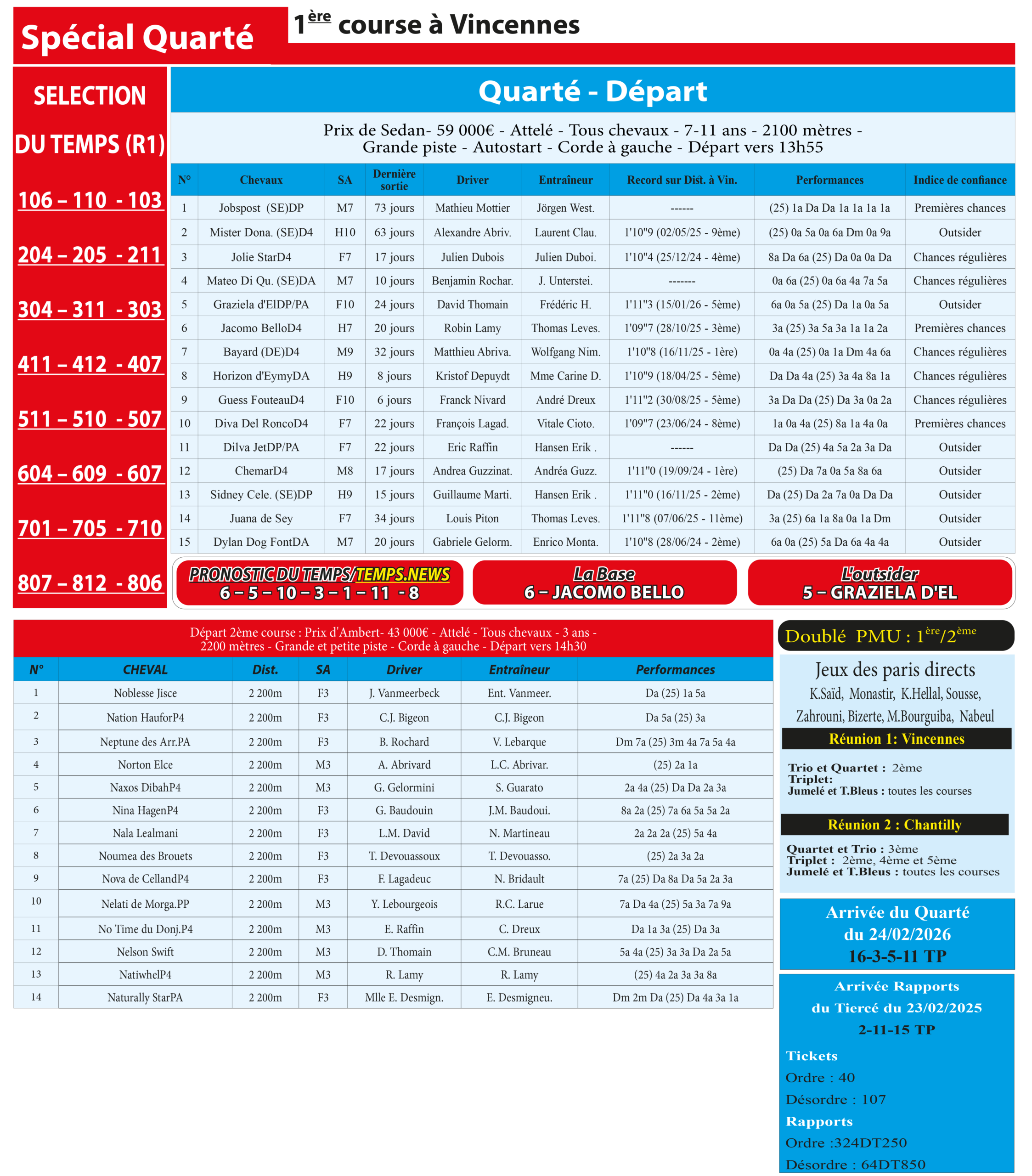 Partager Facebook Twitter LinkedIn Pinterest Email Notre spécial Quarté d’aujourd’hui, 1ère course à Vincennes, donne notre pronostic du Temps/ Temps News avec le cheval n°6 Jacomo Bello étant la base, tandis que le coup de poker est le cheval n°5 Graziela d’El. PMU Quinté Turf