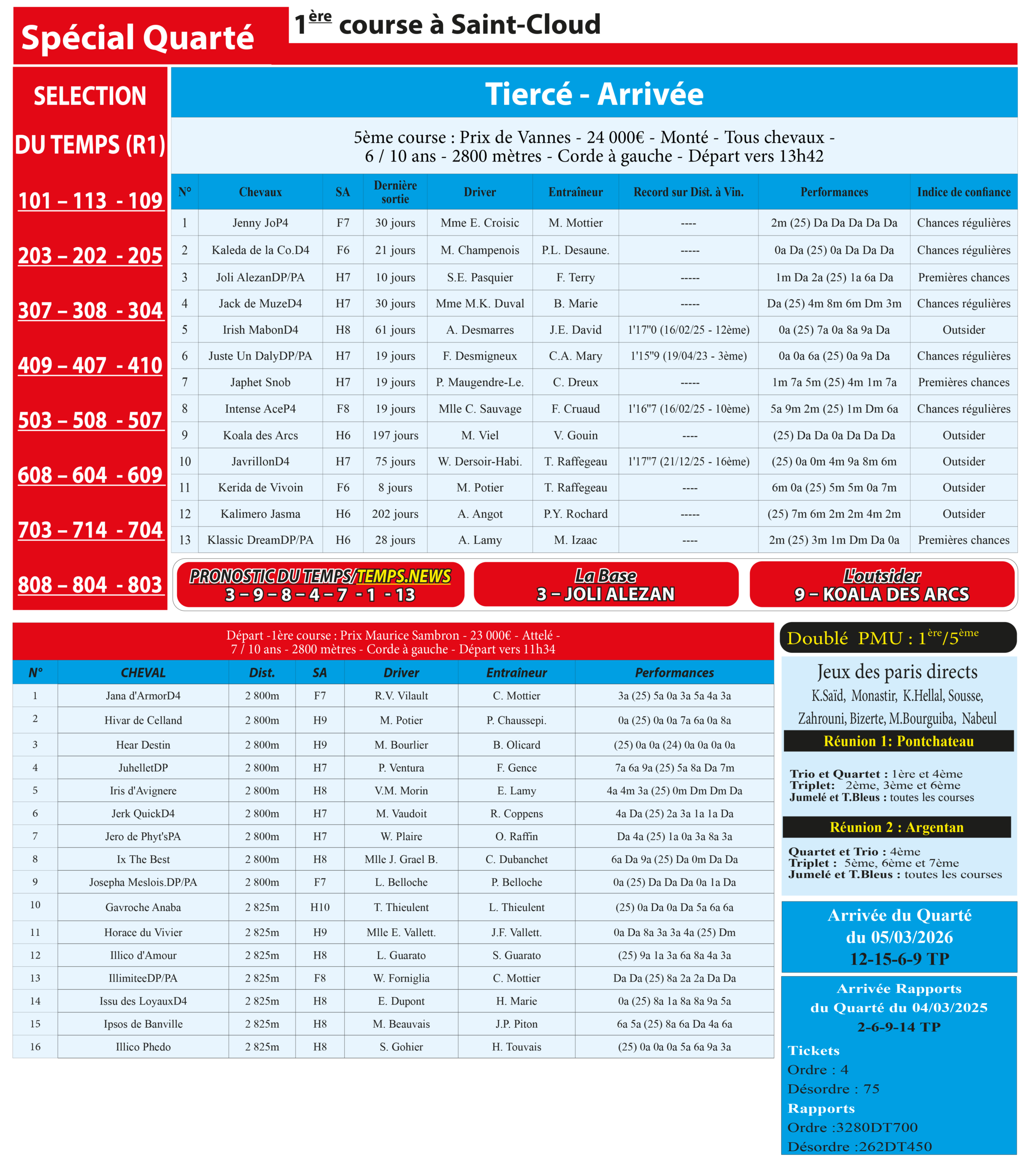 Partager Facebook Twitter LinkedIn Pinterest Email Notre spécial Tiercé d’aujourd’hui, 5ème course à Pontchâteau, donne notre pronostic du Temps/ Temps News avec le cheval n°3 Joli Alezan étant la base, tandis que le coup de poker est le cheval n°9 Koala des Arcs. PMU Turf