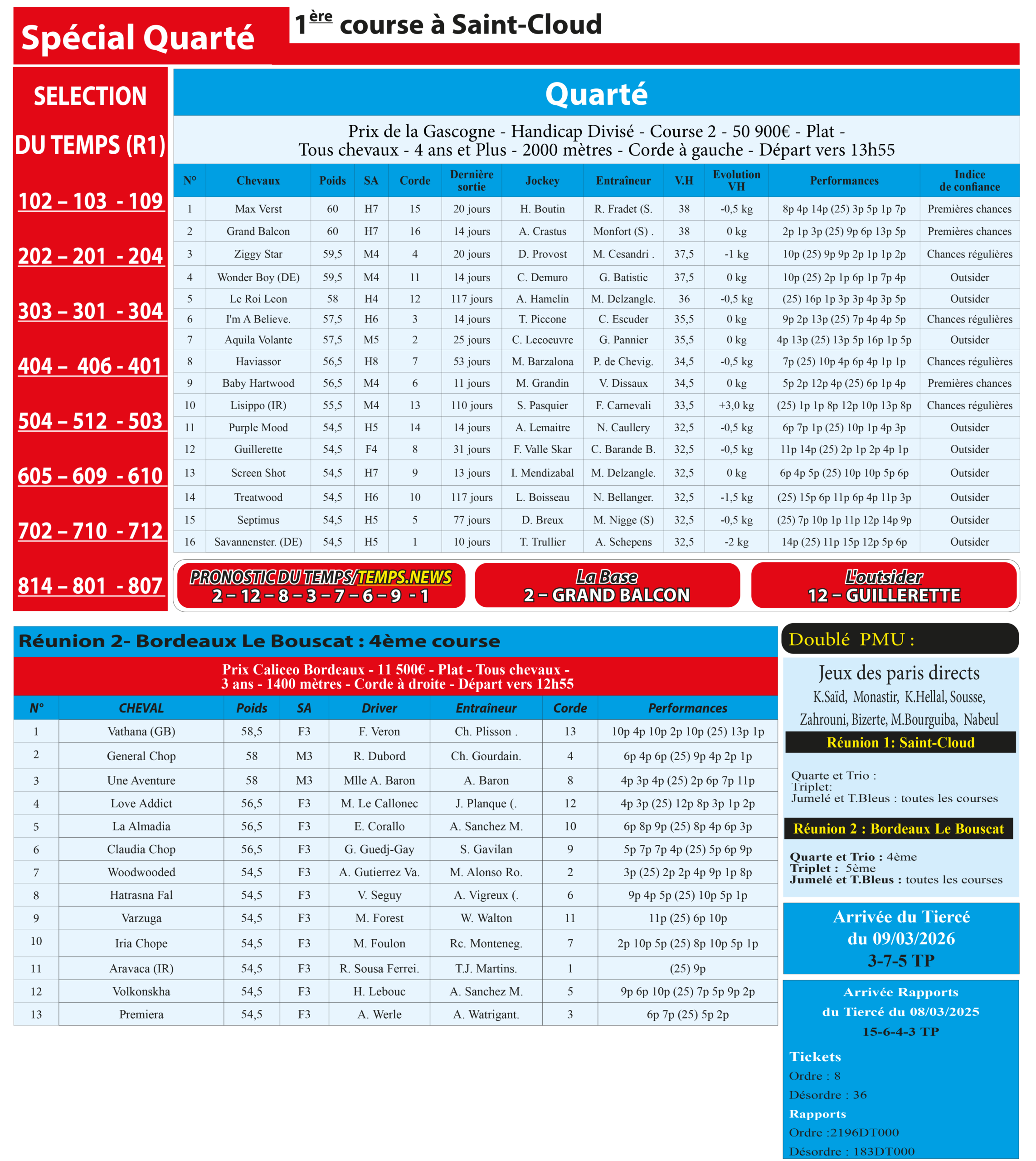 Partager Facebook Twitter LinkedIn Pinterest Email Notre spécial Quarté d’aujourd’hui, 1ère course à Saint-Cloud, donne notre pronostic du Temps/ Temps News avec le cheval n°2 Grand Balcon étant la base, tandis que le coup de poker est le cheval n°12 Guillerette. PMU Quinté Turf