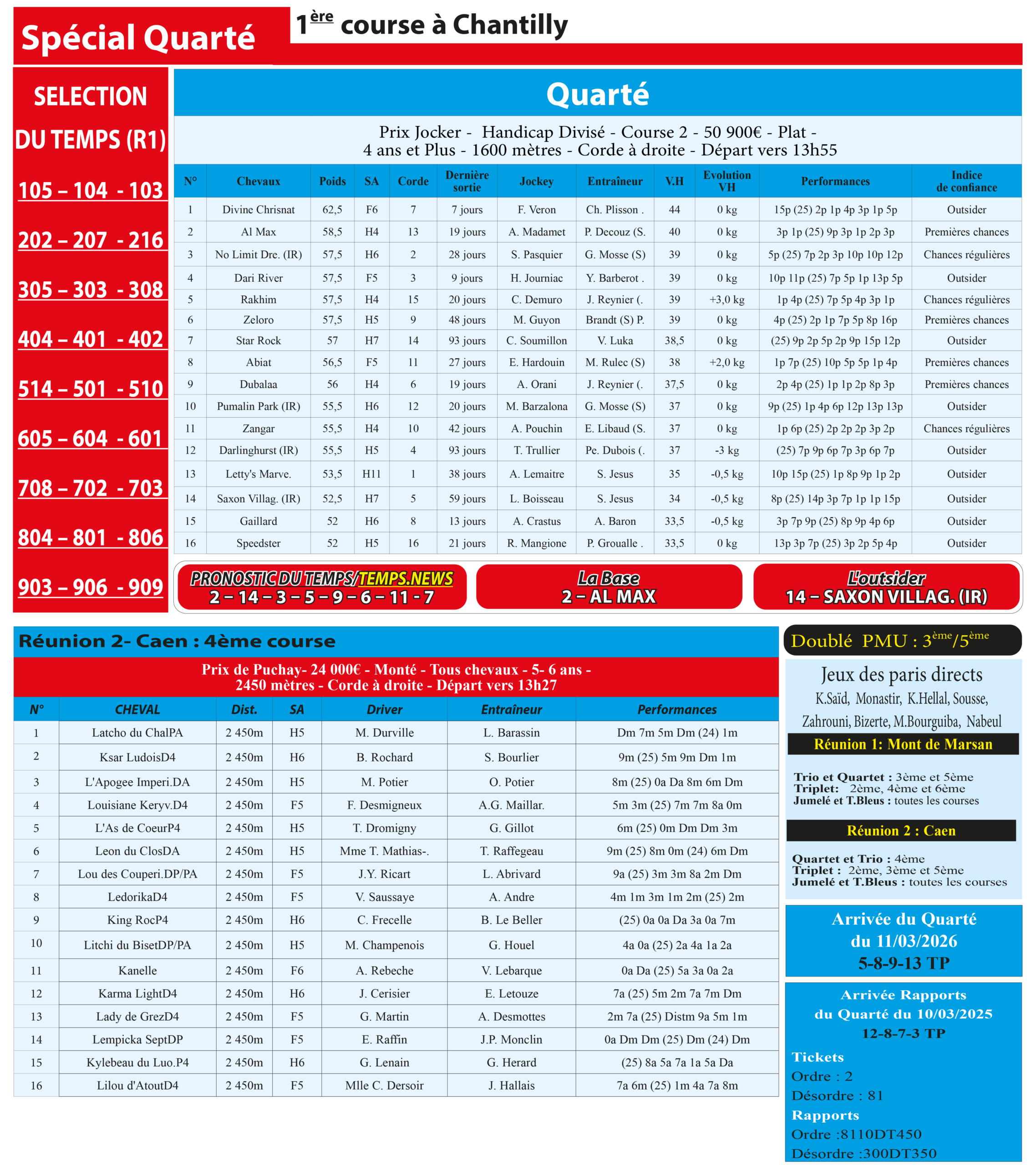 Notre spécial Quarté d’aujourd’hui, 1ère course à Chantilly, donne notre pronostic du Temps/ Temps News avec le cheval n°2 Al Max étant la base, tandis que le coup de poker est le cheval n°14 Saxon Villag. (IR).