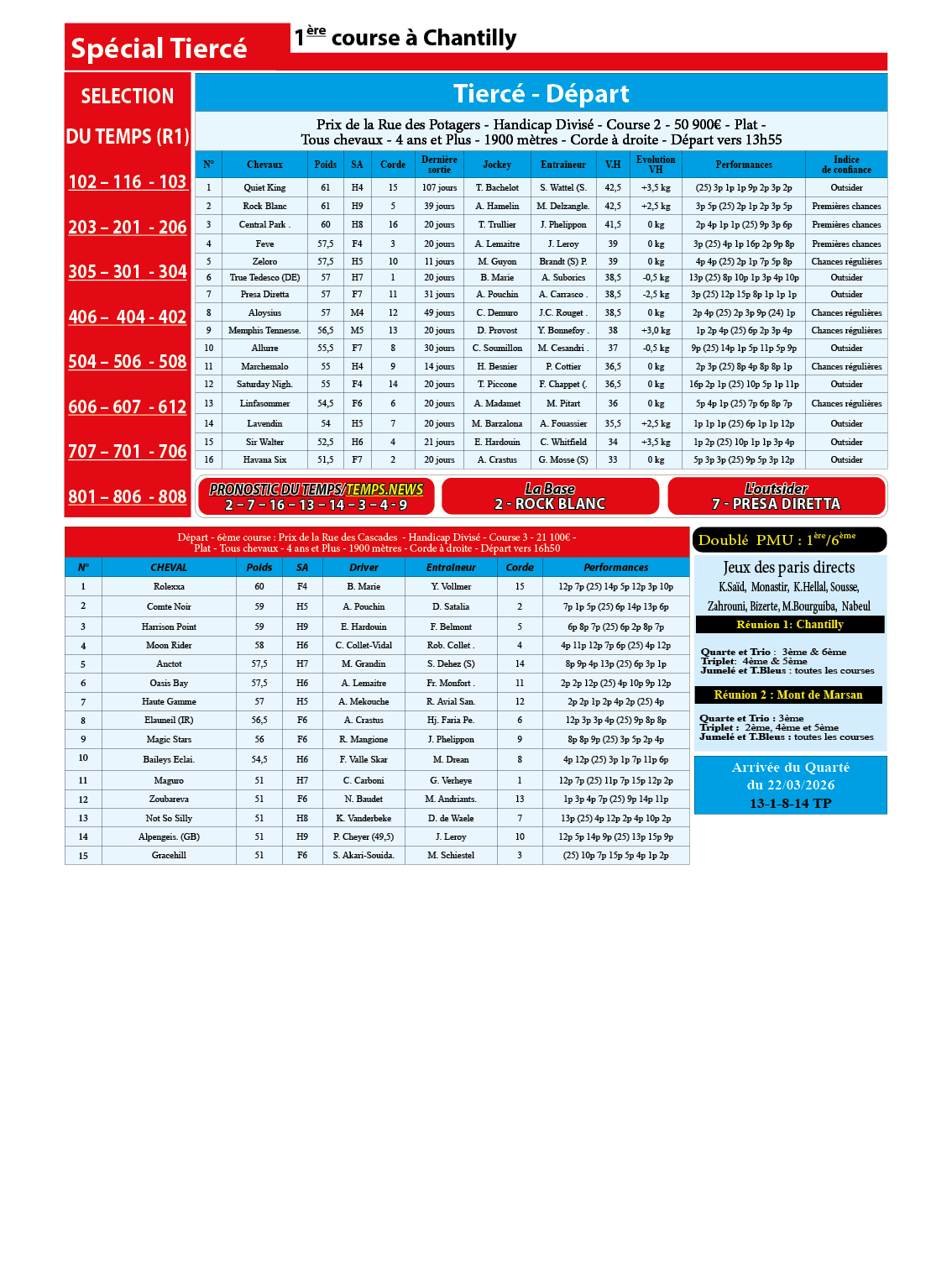 Partager Facebook Twitter LinkedIn Pinterest Email Notre spécial Tiercé d’aujourd’hui, 1ère course à Chantilly, donne notre pronostic du Temps/ Temps News avec le cheval n°2 Rock Blanc étant la base, tandis que le coup de poker est le cheval n°7 Presa Diretta. hippisme PMU Quinté Turf