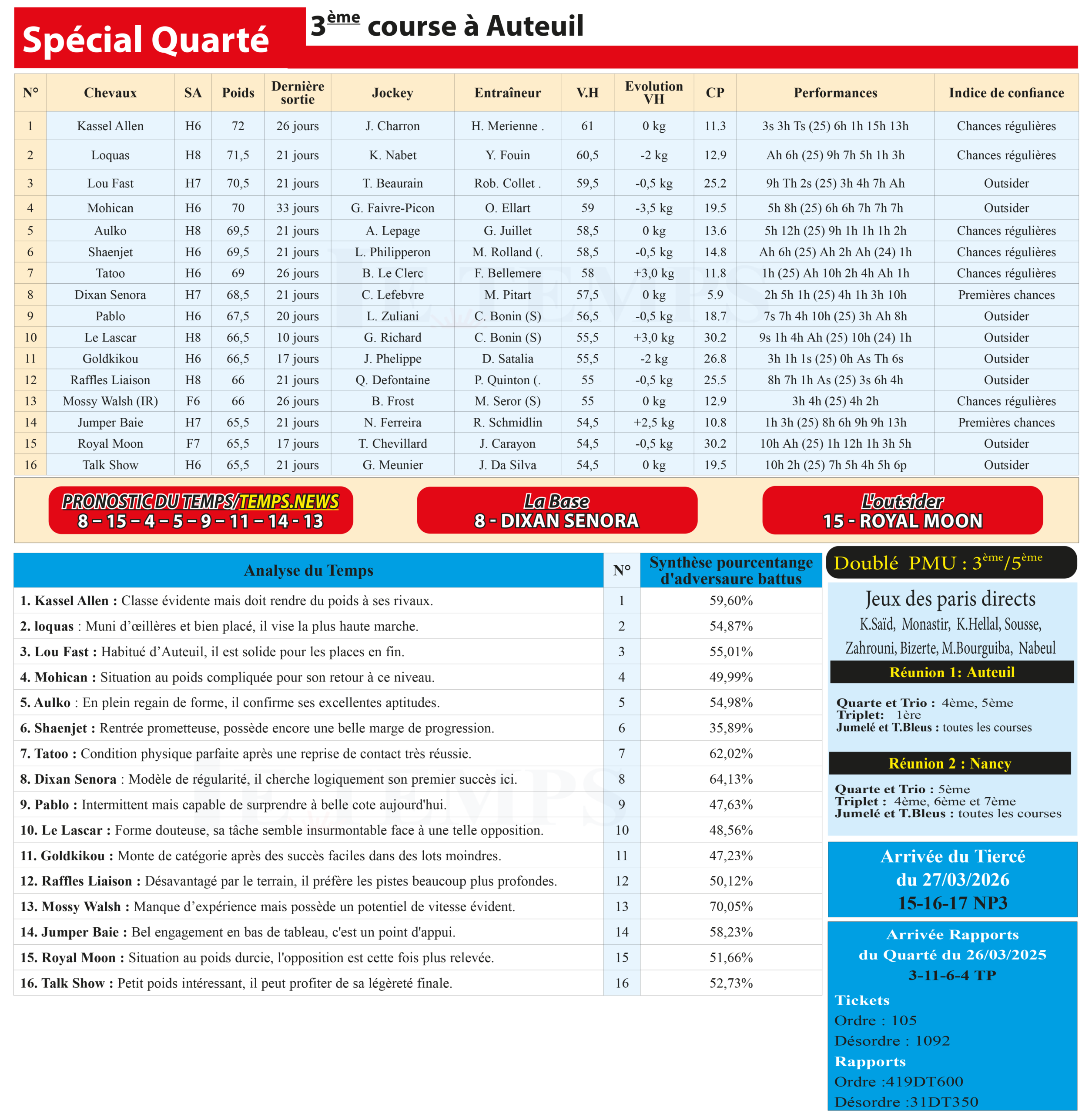 Notre spécial Quarté d’aujourd’hui, 3ème course à Auteuil, donne notre pronostic du Temps/ Temps News;   Dixan Senora (8) : la base absolue, modèle de régularité, il cherche logiquement son premier succès ici.