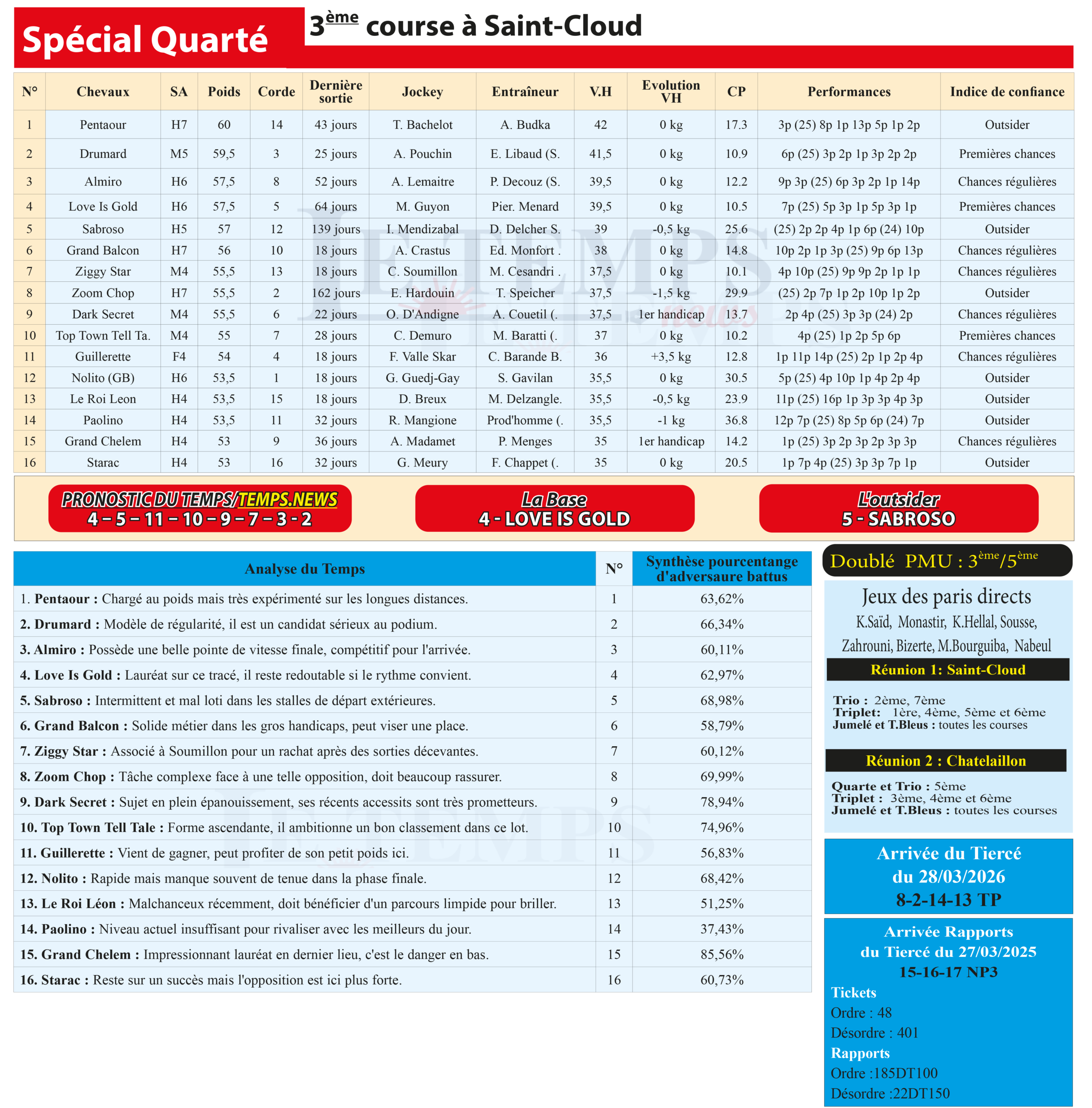 Notre spécial Quarté d’aujourd’hui, 3ème course à Saint-Cloud, donne notre pronostic du Temps/ Temps News; Love Is Gold (4) : la base absolue, lauréat sur ce tracé, il reste redoutable si le rythme convient.