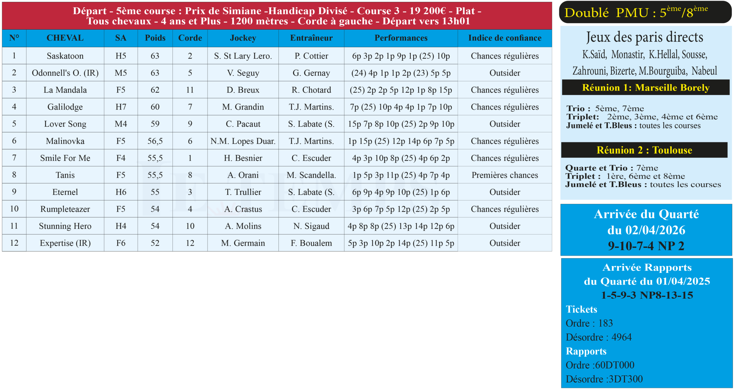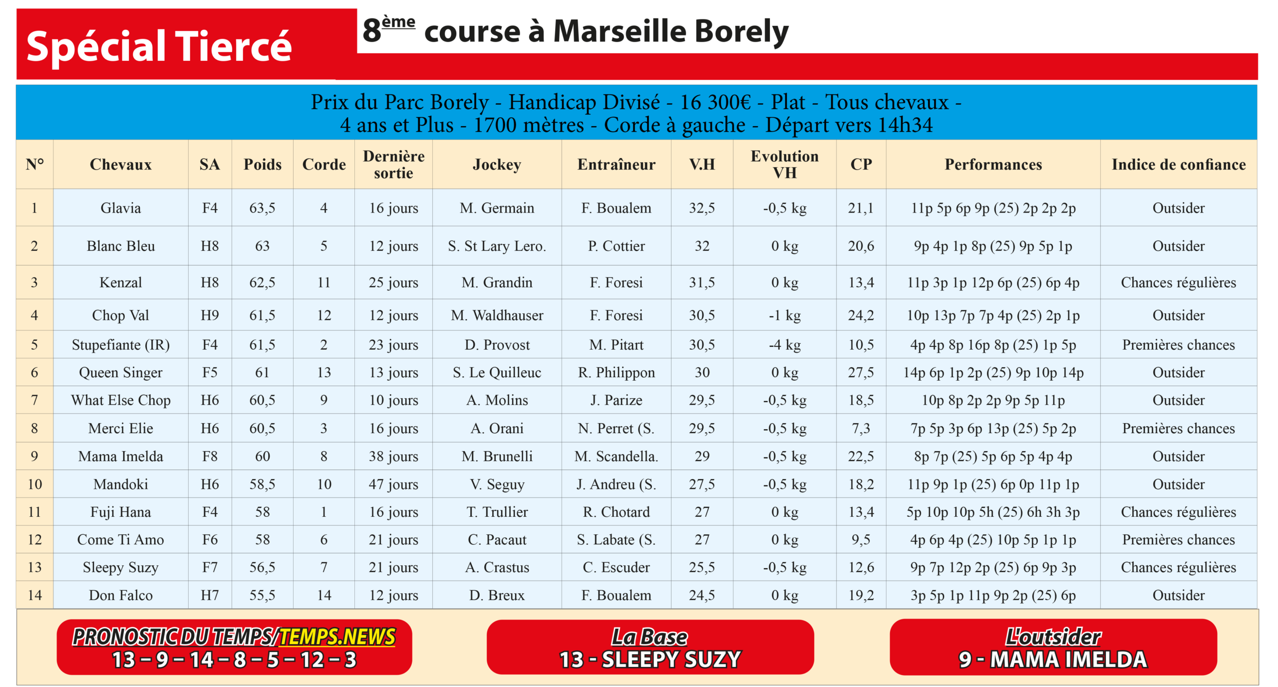 Notre spécial Tiercé demain, 8ème course à Marseille Borely, donne notre pronostic du Temps/ Temps News; Sleepy Suzy (13) : la base absolue ; Mama Imelda(9) : l’outsider en pleine évolution,