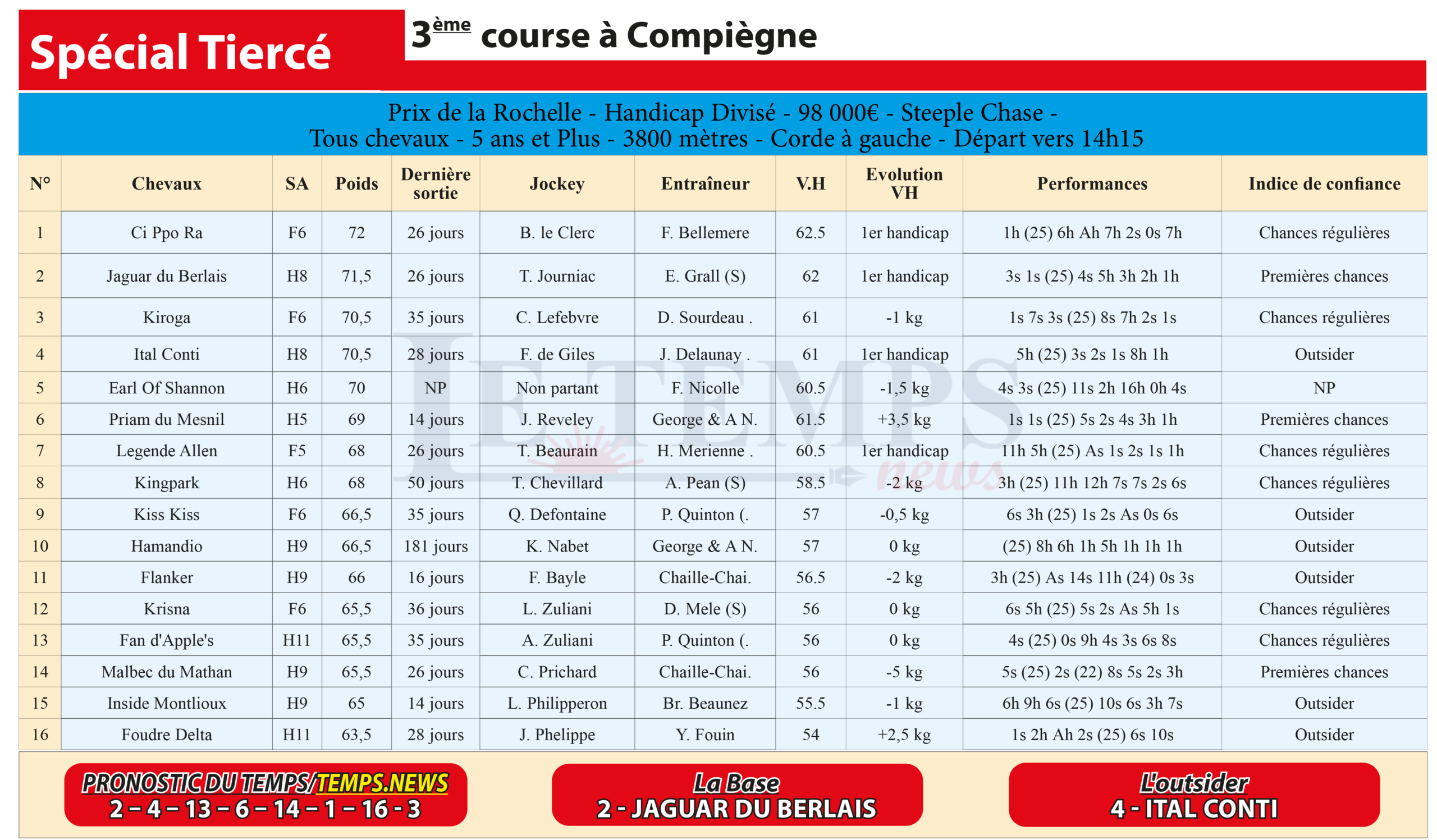Retrouvez ici l’Analyse du Temps, notre étude approfondie des 16 partants du Prix de la Rochelle. Nous décryptons pour vous la forme, les statistiques et les meilleures chances de ce rendez-vous à Compiègne.