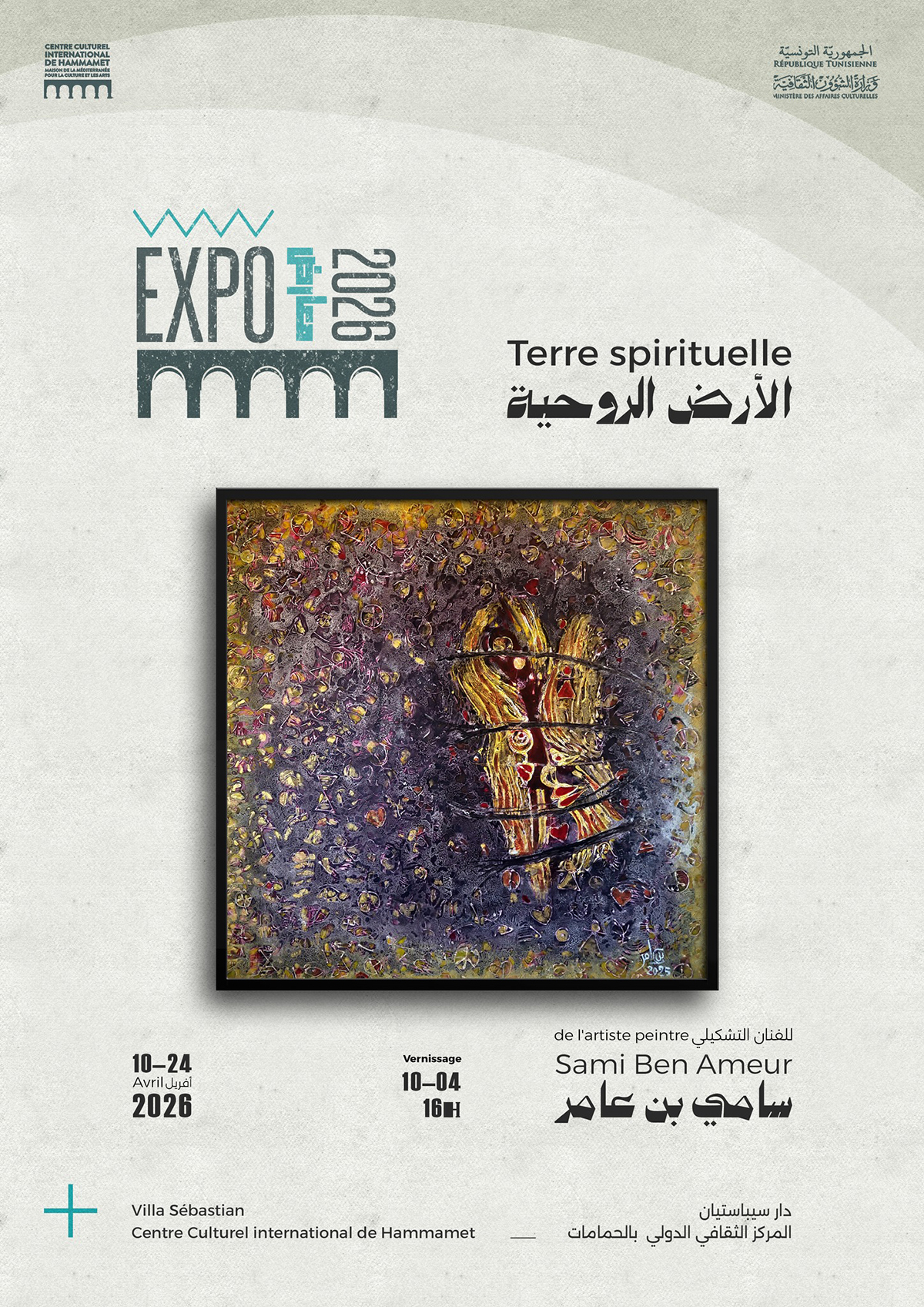 Cette exposition réunit  une trentaine d’œuvres récentes autour d’un questionnement esthétique et philosophique sur l’origine, la mémoire et la transcendance. Connu pour sa peinture matiériste mêlant signes anciens, gestualité expressive et sensibilité tactile profonde, Sami Ben Ameur développe ici une nouvelle série où la terre  dans sa dimension intime, originelle et spirituelle  devient un territoire d’amour, de silence et de résistance.