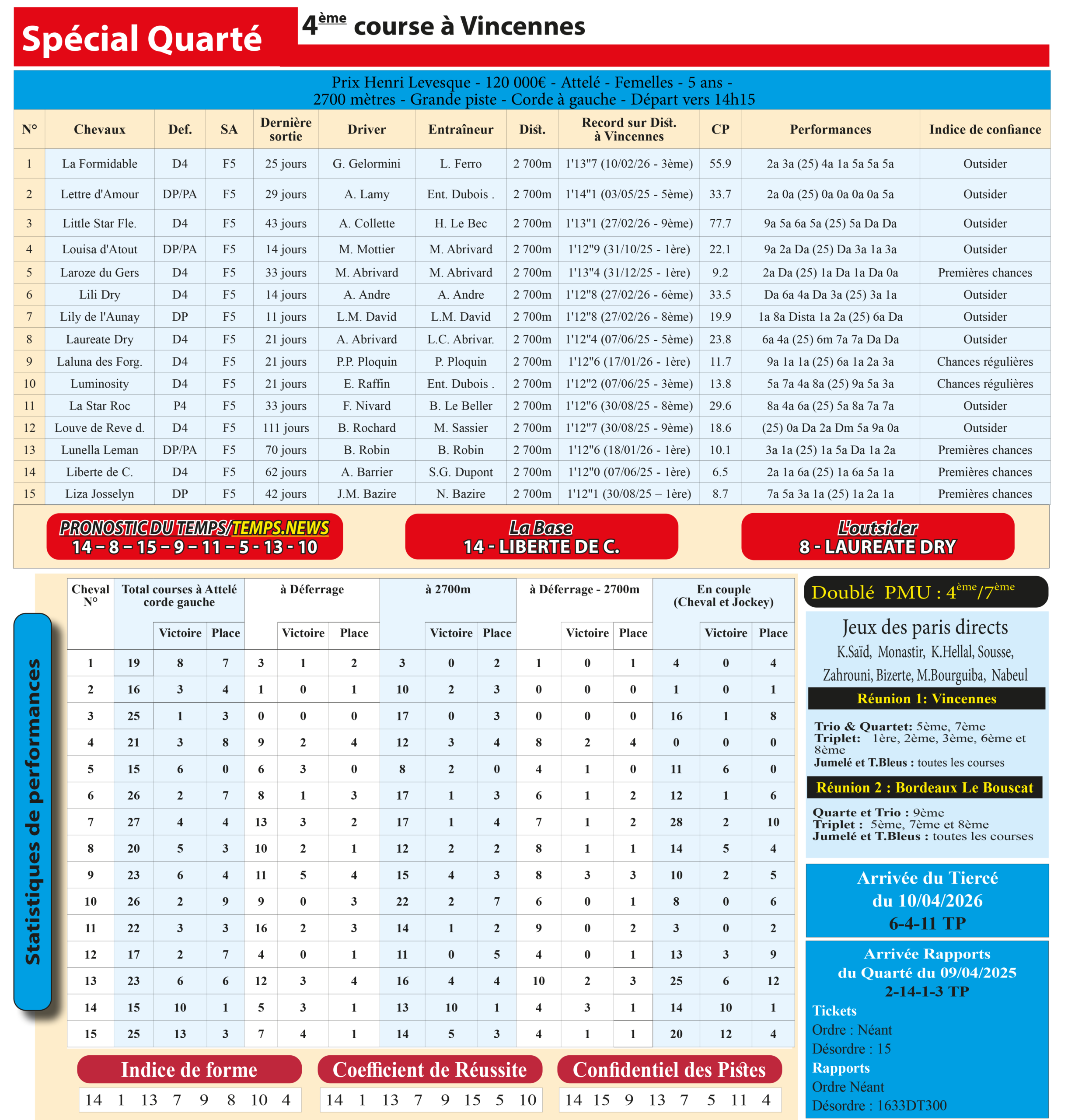 Le cheval 14– Liberté de Choisel s’impose comme notre base solide pour ce Spécial Quarté, tandis que le 8– Laureate Dry sera notre outsider préféré, capable de créer la surprise à belle cote. Une combinaison équilibrée pour viser les sommets sur l’hippodrome de Vincennes.