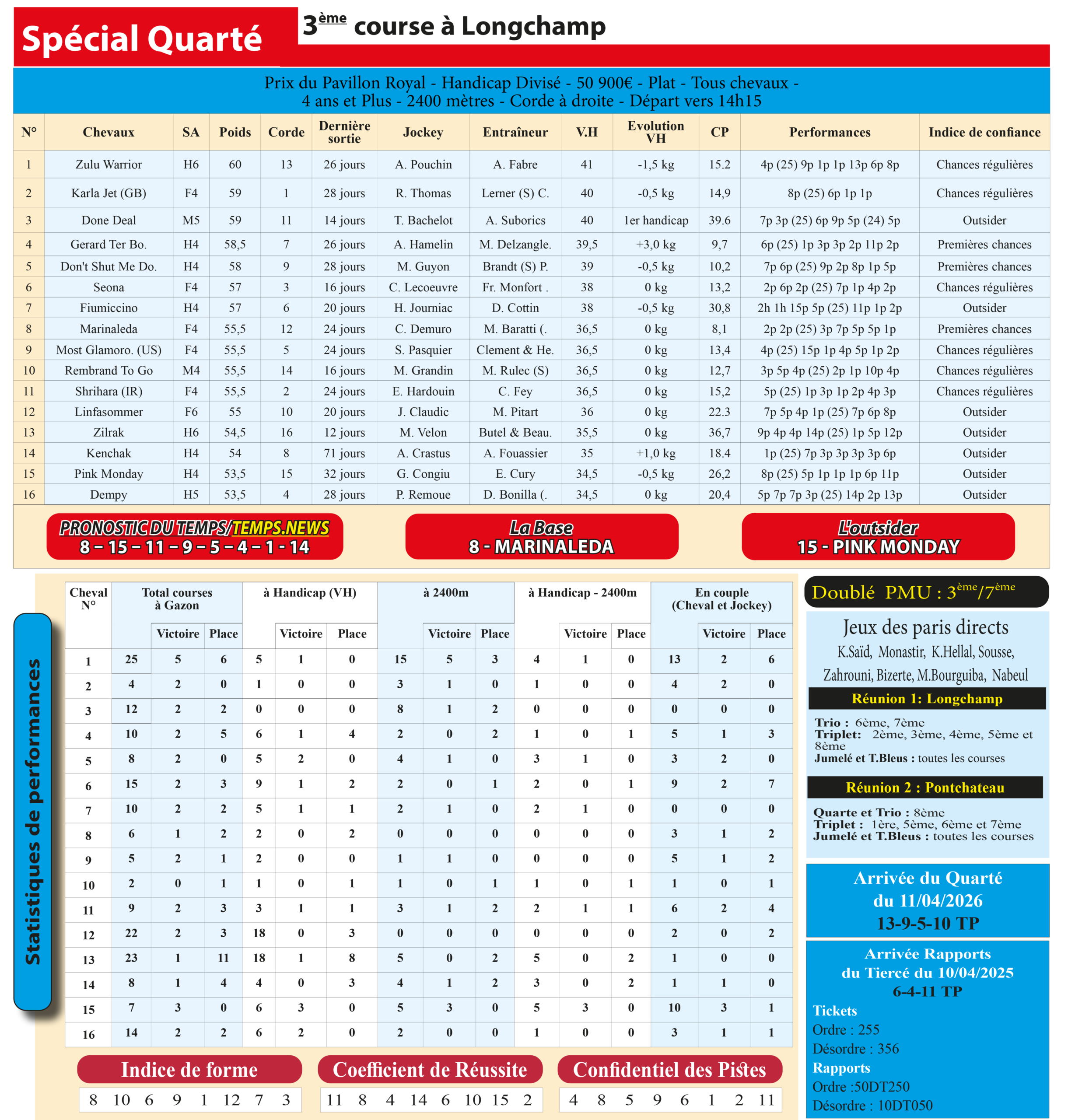 Le cheval 8– Marinaleda s’impose comme notre base solide pour ce Spécial Quarté, tandis que le 15– Pink Monday sera notre outsider préféré, capable de créer la surprise à belle cote. Une combinaison équilibrée pour viser les sommets sur l’hippodrome de Longchamp.