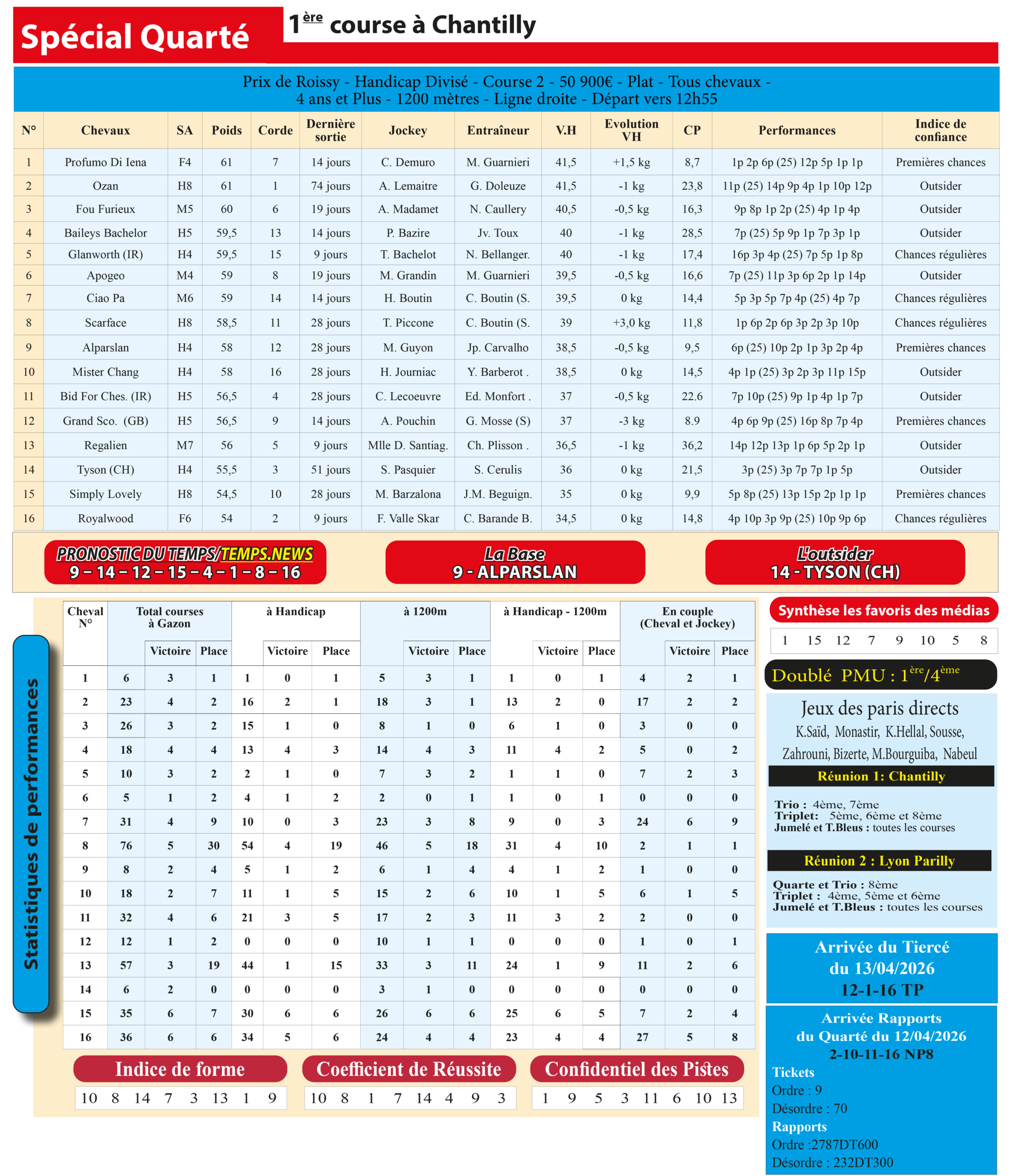 Le cheval 9– Alparslan s’impose comme notre base solide pour ce Spécial Quarté, tandis que le 14– Tyson sera notre outsider préféré, capable de créer la surprise à belle cote. Une combinaison équilibrée pour viser les sommets sur l’hippodrome de Chantilly.