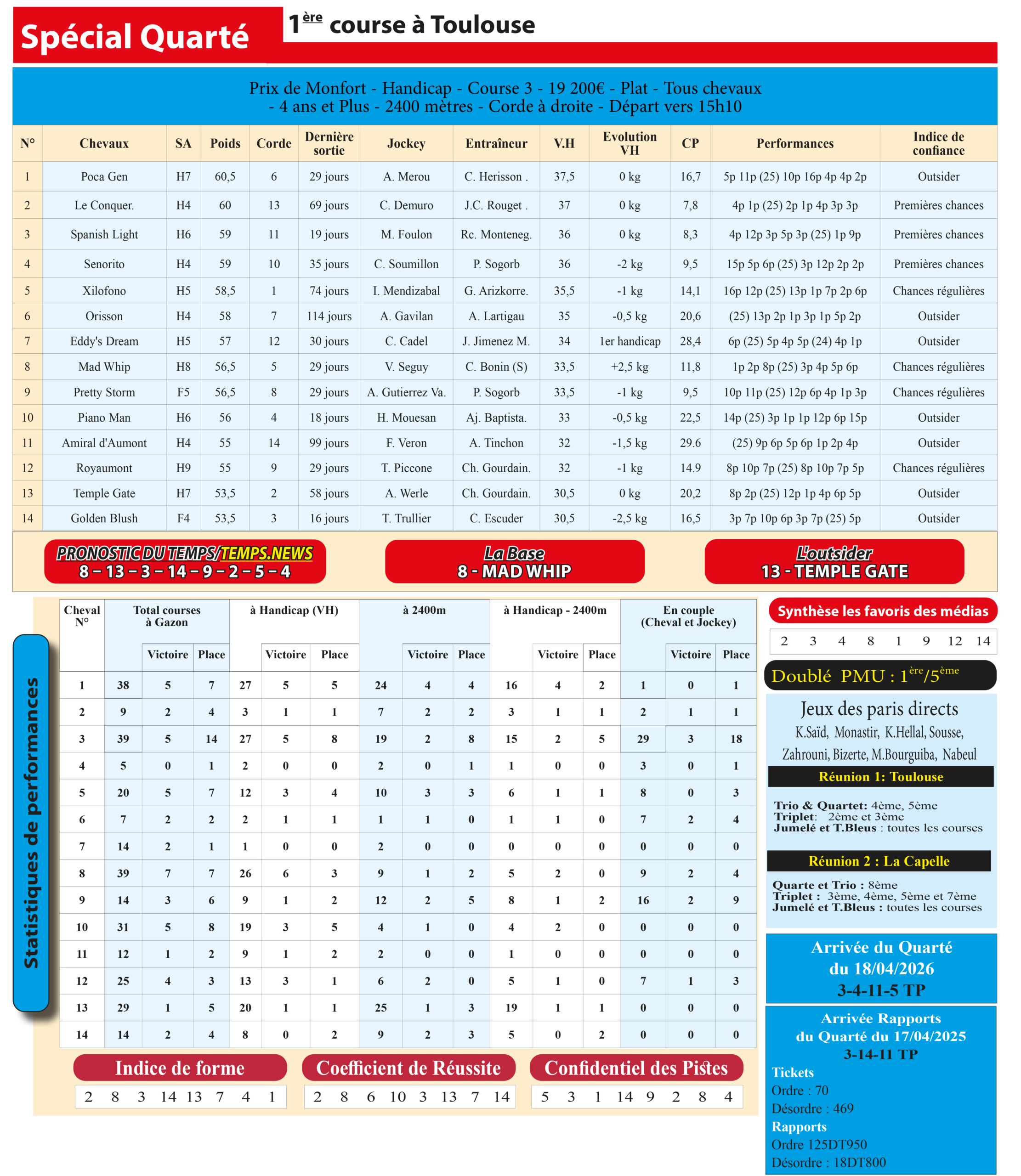 ​Le cheval 8– Mad Whip s’impose comme notre base solide pour ce Spécial Quarté, tandis que le 13– Temple Gate sera notre outsider préféré, capable de créer la surprise à belle cote. Une combinaison équilibrée pour viser les sommets sur l’hippodrome de Toulouse.