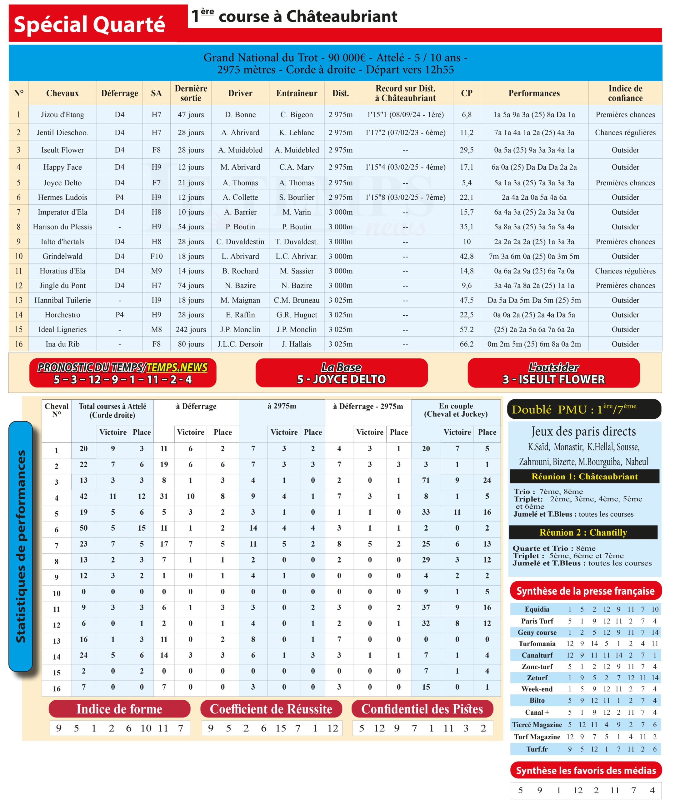 Retrouvez ici l’Analyse du Temps, notre étude approfondie des 16 partants du Grand National du Trot à Châteaubriant. Nous décryptons pour vous la forme, les statistiques et les meilleures chances de ce rendez-vous à Châteaubriant: