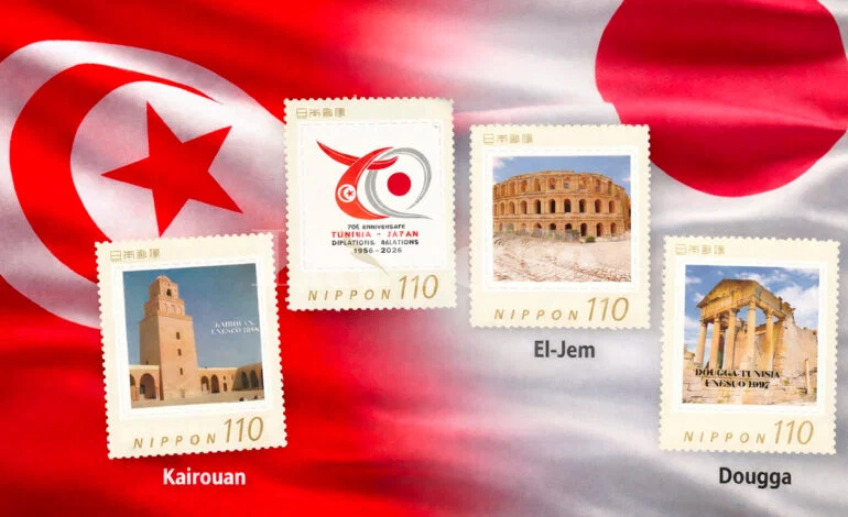 L’Ambassade de Tunisie au Japon a émis une collection commémorative de quatre timbres-poste à l’occasion du 70e anniversaire de l’établissement des relations diplomatiques entre la Tunisie et le Japon, une initiative visant à célébrer ce jubilé et à renforcer la présence culturelle de la Tunisie dans l’archipel nippon.
