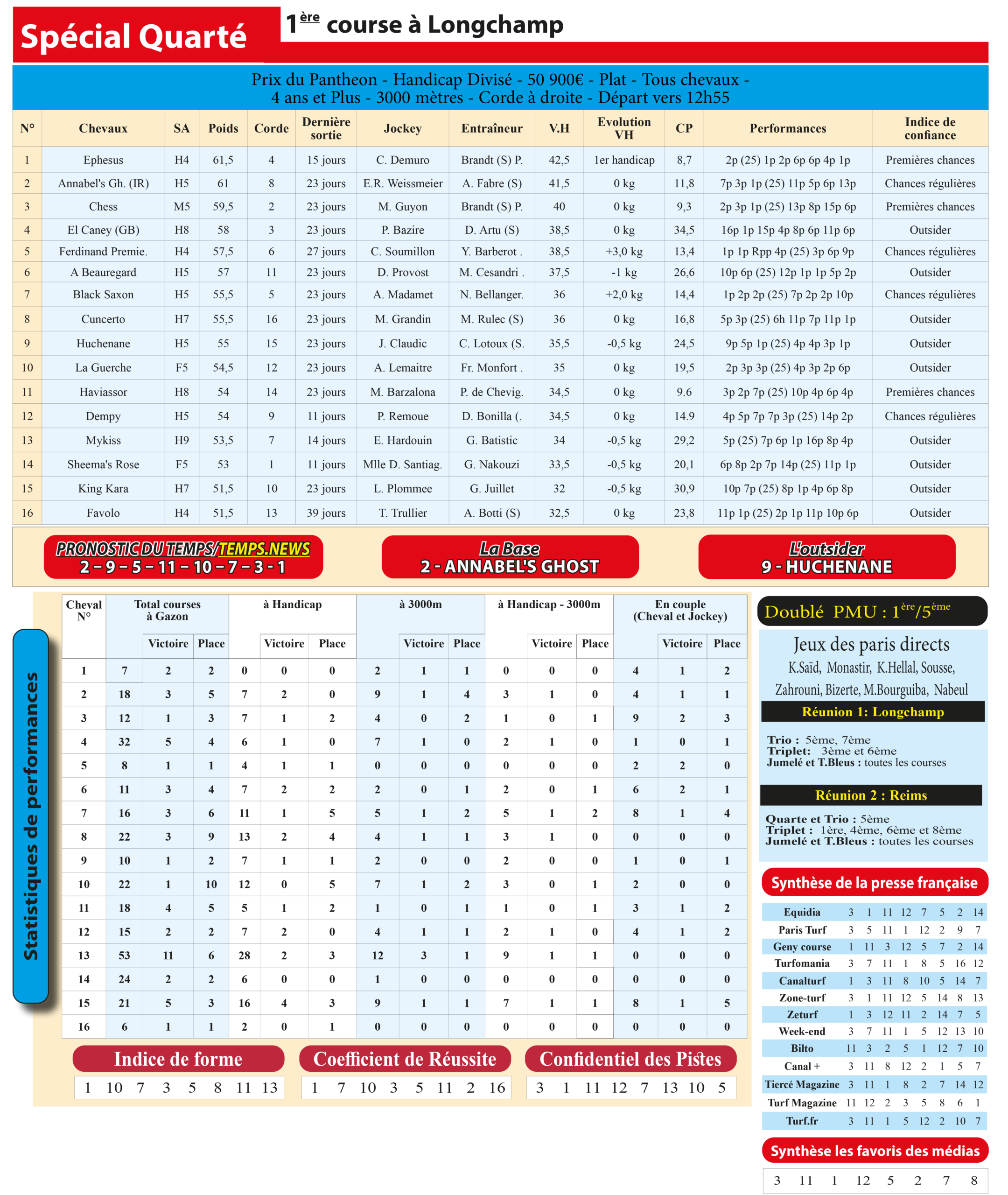 Le cheval 2– Annabel’s Ghost s’impose comme notre base solide pour ce Spécial Quarté, tandis que le 9– Huchenane sera notre outsider préféré, capable de créer la surprise à belle cote. Une combinaison équilibrée pour viser les sommets sur l’hippodrome de Longchamp.
