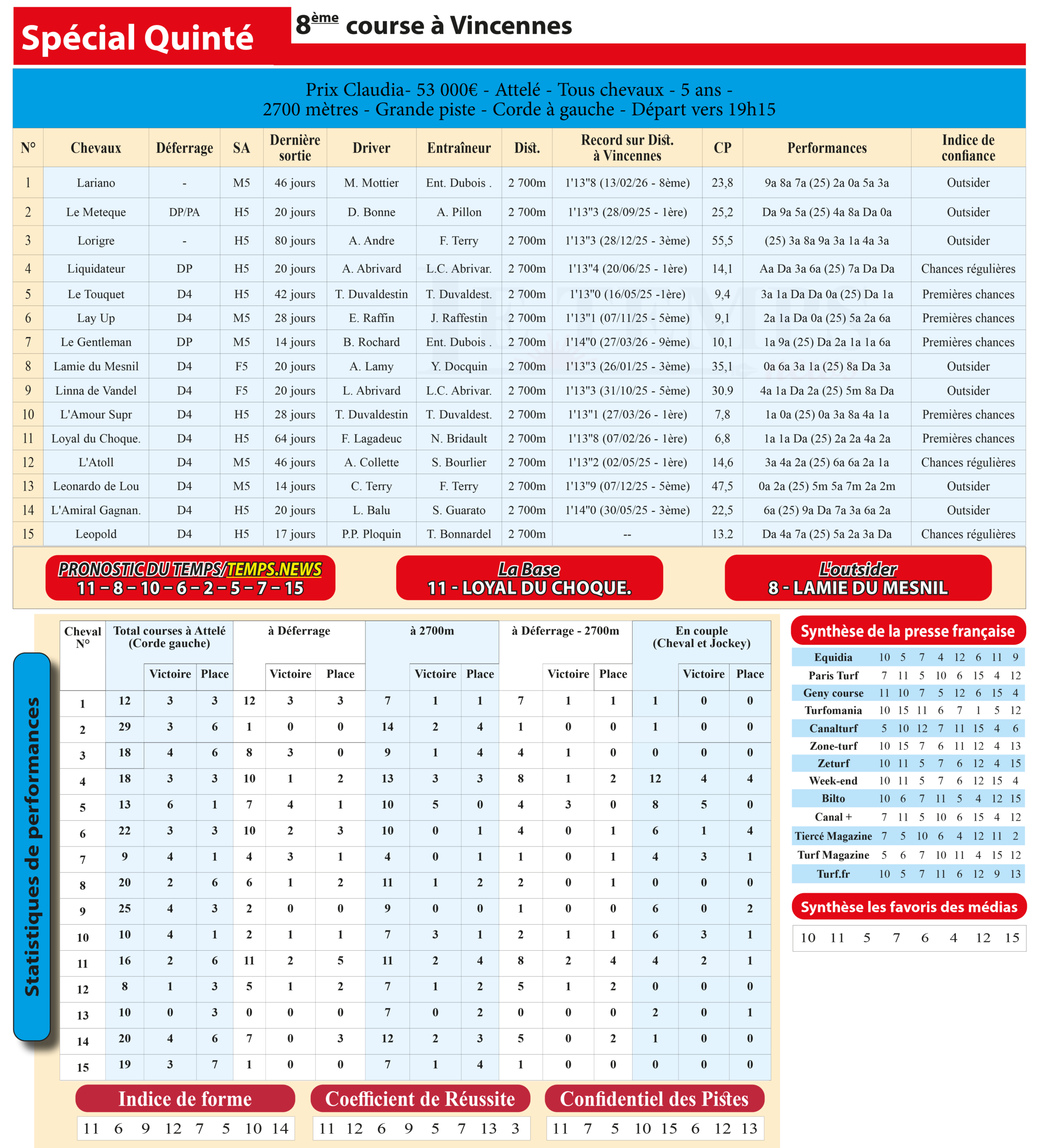 Le cheval 11– Loyal du Choque s’impose comme notre base solide pour ce Spécial Quinté, tandis que le 8– Lamie du Mesnil sera notre outsider préféré, capable de créer la surprise à belle cote. Une combinaison équilibrée pour viser les sommets sur l’hippodrome de Vincennes.