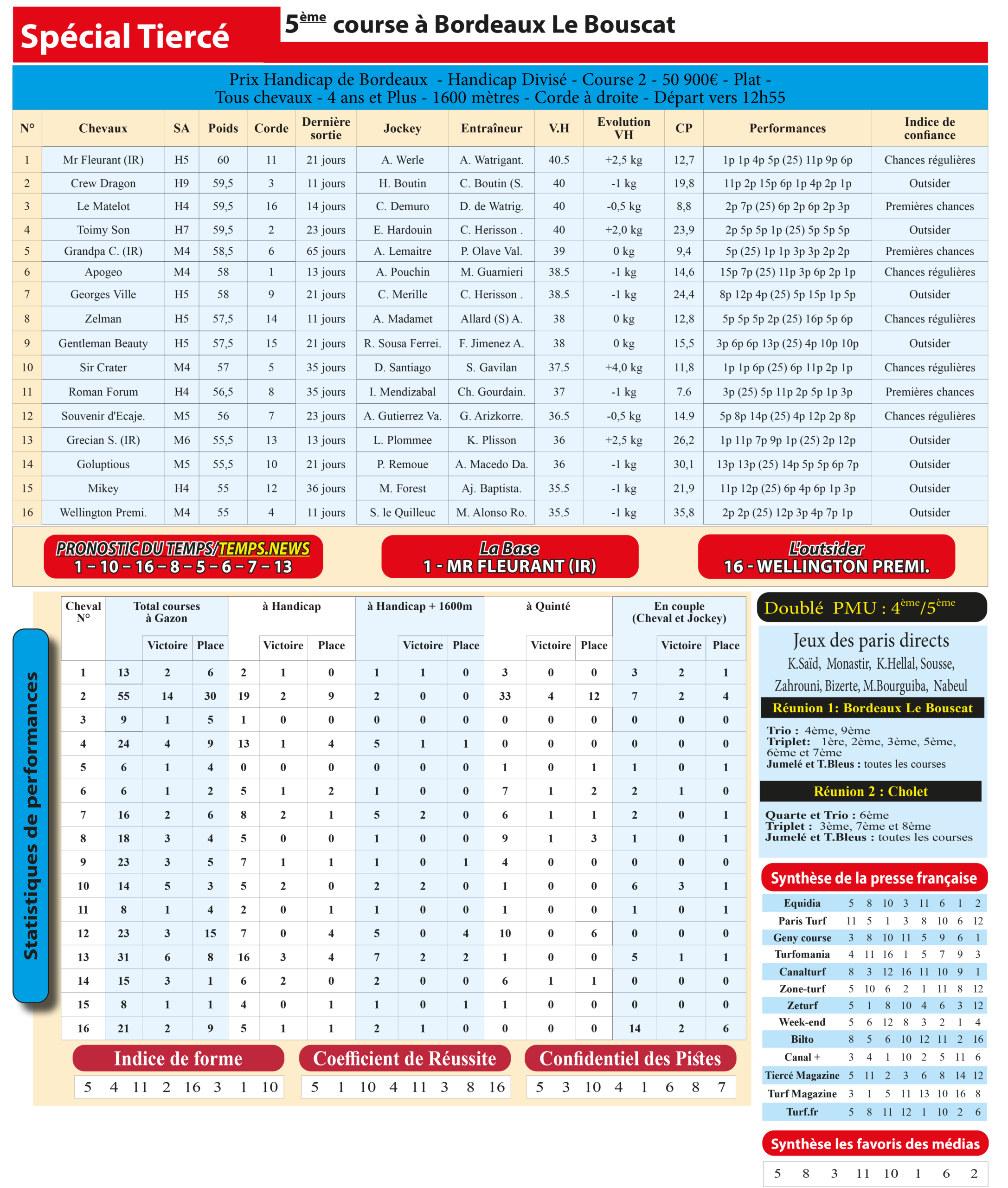 Le cheval 1– Mr Fleurant s’impose comme notre base solide pour ce Spécial Tiercé, tandis que le 16– Wellington Premier sera notre outsider préféré, capable de créer la surprise à belle cote. Une combinaison équilibrée pour viser les sommets sur l’hippodrome de Bordeaux Le Bouscat.