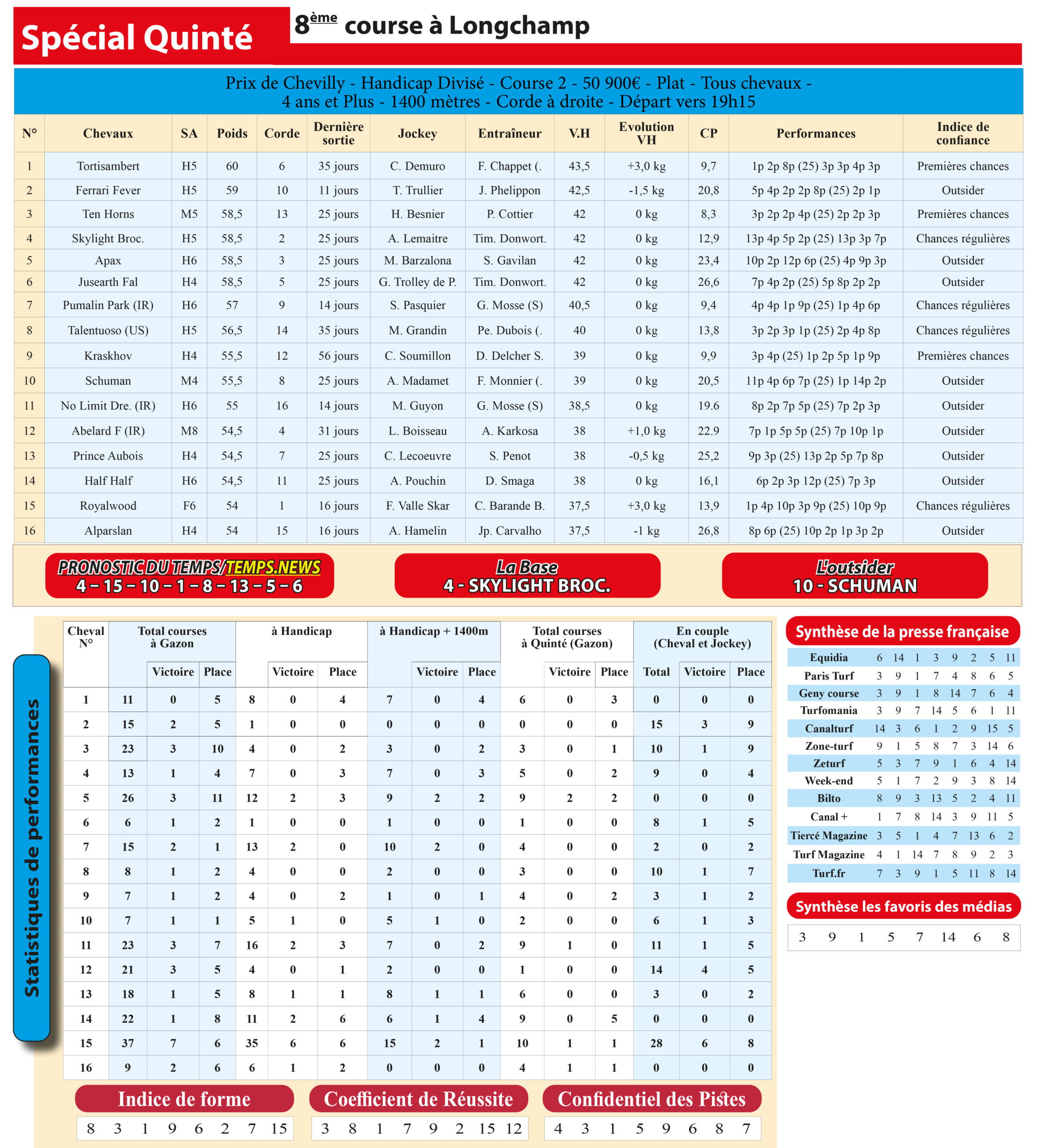 Retrouvez ici l’Analyse du Temps, notre étude approfondie des 16 partants du Prix de Chevilly. Nous décryptons pour vous la forme, les statistiques et les meilleures chances de ce rendez-vous à Longchamp :