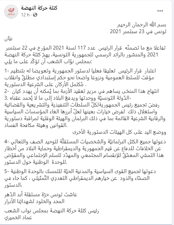 S’exprimant sur les décisions annoncées par Kais Saied, le bloc parlementaire Ennahdha a dénoncé, dans un communiqué rendu public, le fait que le Président de la République détienne les trois pouvoirs, à savoir l’exécutif, le législatif et le judiciaire.