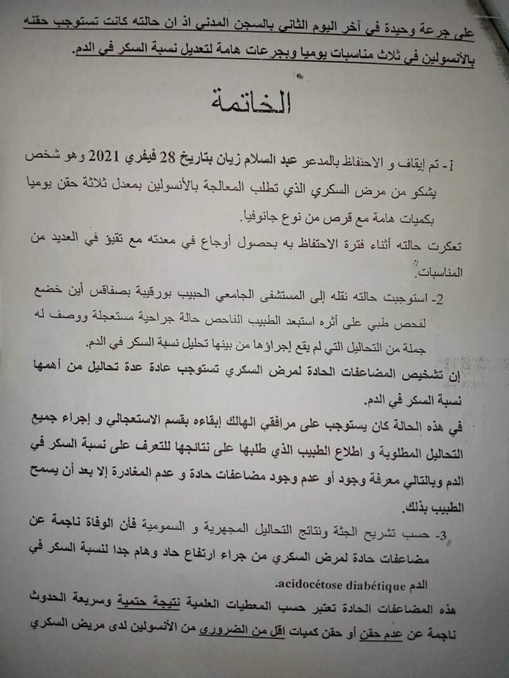 Le rapport a prouvé que les complications qui ont conduit au décès étaient dues au fait qu’Abdel Salam Zayan n’a pas reçu d’insuline pendant environ deux jours consécutifs en détention. « Une seule dose injectée à la fin du deuxième jour à la prison, ne suffisait pas, insiste le rapport, à éviter la mort du défunt »