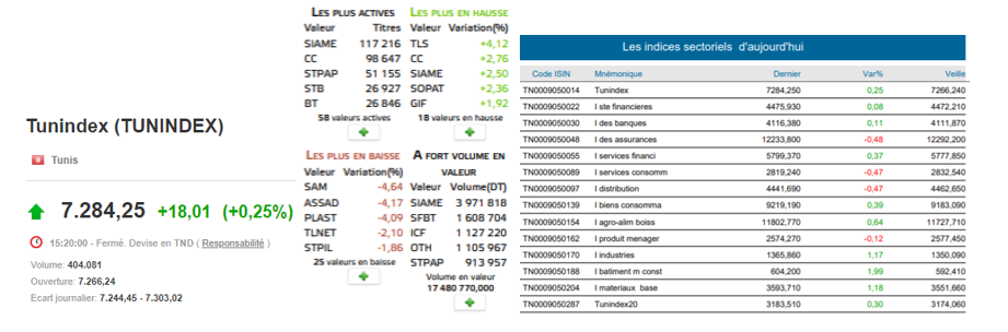 Après avoir clôturé en hausse, mardi, le TUNINDEX confirme sa tendance au rebond, avec une augmentation de 18.01 pts et -0.25% à 7 284.25 pts.