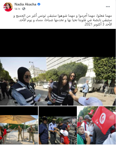 Elle a posté quelques photos des manifestations qui ont été organisées, hier, dans plusieurs gouvernorats, pour soutenir les décisions prises par le président de la République, Kais Saied. Il faut souligner que Nadia Akacha « se distingue » par sa discrétion et qu’elle a rarement recours à des publications sur son mur facebook.