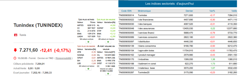 Le TUNINDEX confirme sa consolidation baissière, avec une nouvelle baisse de 12.41 pts et -0.17% à 7 271.60 pts.