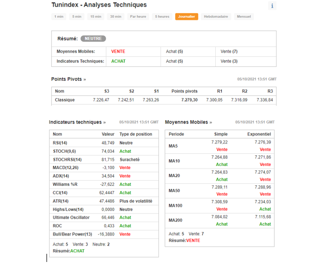 Au niveau des indicateurs techniques, en données quotidiennes, le TUNINDEX dévie et se trouve dans la zone -ACHAT-NEUTRE.