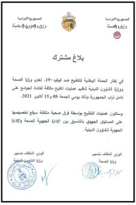 Partager Facebook Twitter LinkedIn Pinterest Email Le ministère des Affaires religieuses a publié, aujourd’hui, un communiqué dans lequel il a indiqué qu’une campagne de vaccination intensive contre le coronavirus sera organisée dans les mosquées les 8 et 15 octobre 2021. LIM Covid-19 ministère des Affaires religieuses - Tunisie mosquées vaccination