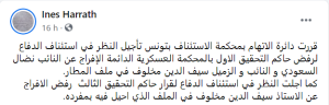 L’Avocate Ines Harrath a publié un post sur sa page officielle dans lequel elle a fait savoir que la Cour d’appel de Tunis a décidé de reporter l’examen du recours en appel en faveur de ses clients