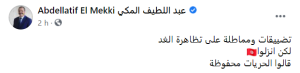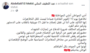 L’ex dirigeant du parti Ennahdha, Abdellatif El Mekki, a appelé dans un post publié sur sa page officielle, les Tunisiens à manifester en masse demain, contre les mesures exceptionnelles de Kais Saied.