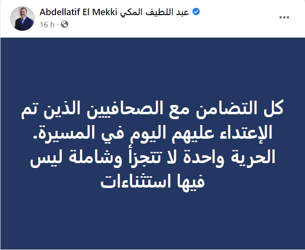 L’ancien dirigeant du parti Ennahdha, Abdellatif El  Mekki, a exprimé son soutien aux journalistes qui ont été agressés, hier, lors de la manifestation contre les mesures exceptionnelles de Kais Saied. Apprend-on d’un post publié sur sa page officielle.