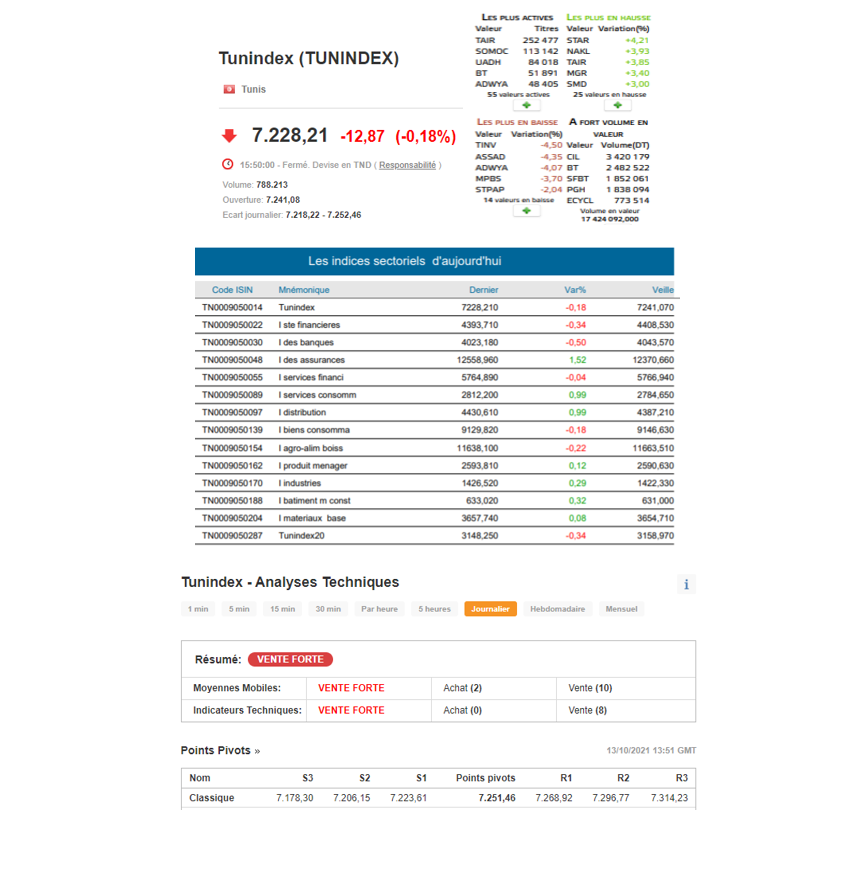 Le TUNINDEX confirme sa tendance baissière, avec un repli de 12.87 points et de -0.18% à 7 228.21 pts.