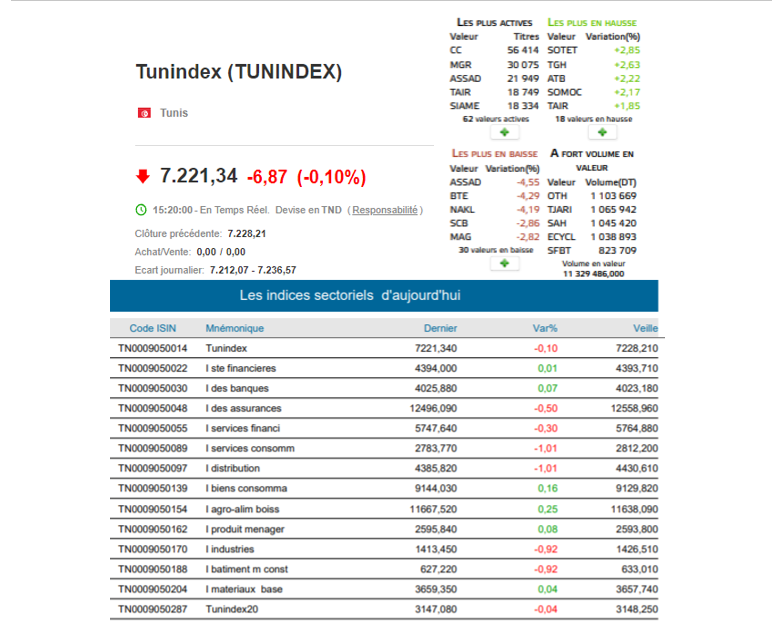 Le TUNINDEX cède 6.87 points, soit -0.10% à 7 221.34 pts.