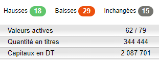 Sur 62 panneaux actifs, 18 étaient à la hausse et 29 à la baisse et plus 2.0 MDT de transactions.