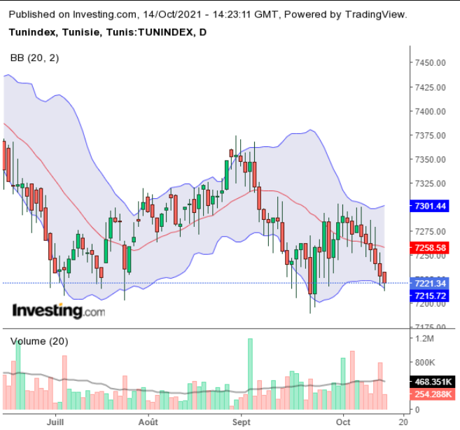 D’un point de vue graphique, la clôture baissière de ce jeudi, vers le seuil des 7200 points, confirme, comme nous l’avions prédit, que le biais baissier du TUNINEX est bien installé, en attendant des signaux positifs forts. Le franchissement baissier de ce seuil, mettra sur le viseur la zone de soutien à 7180 -7200 points (R1). Auquel cas, le creux marqué au 01 octobre, risque d’être largement dépassé.