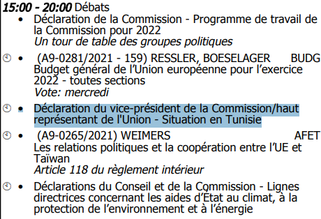 Le Parlement européen a publié, hier, une note dans son agenda, indiquant que la situation politique en Tunisie sera à l’ordre du jour d’une séance plénière au Parlement européen, qui aura lieu le 19 octobre 2021 .