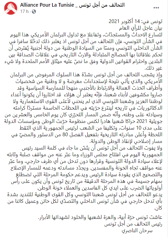 Le parti de l’Alliance pour la Tunisie, s’est exprimé, dans un communiqué rendu public, sur l’audition dédiée à l’examen de la situation en Tunisie au congrès américain.