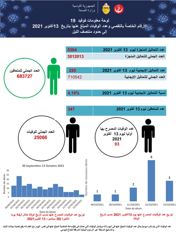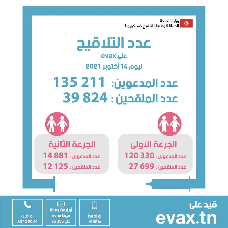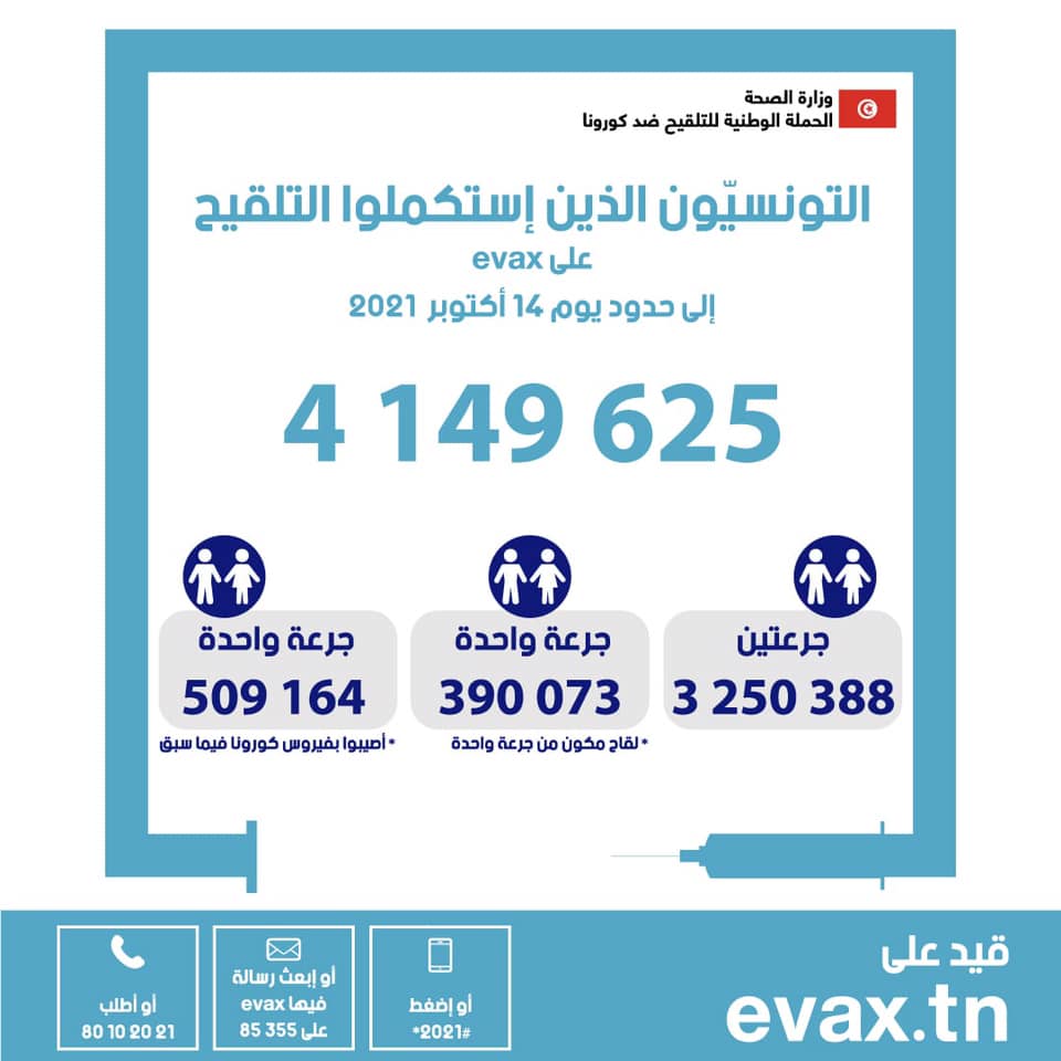 Dans le même contexte, dans un autre bilan publié hier le 14 octobre,  le ministère de la Santé  a indiqué que plus de 4 million de Tunisiens (plus de 35% de la population) sont totalement vaccinés jusqu’à la même date : plus de 3 million ont reçu deux doses, 390073 ont reçu une seule dose à cause de la nature du vaccin et 509164 ont reçu, également, une seule dose car ils ont été déjà contaminés.