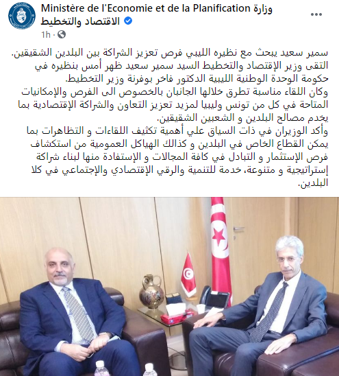 Selon un communiqué rendu public, aujourd’hui, le ministre de l’Economie et de la Planification, Samir Saeid, s’est entretenu, avec son homologue libyen Fakher Boufarna.