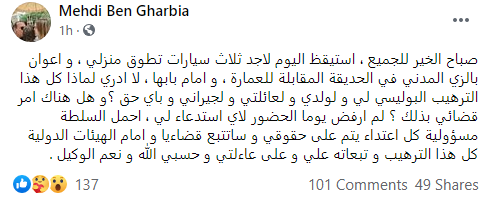 L’homme d’affaires et politicien Mehdi Ben Gharbia a publié un statut sur son compte officiel sur Facebook indiquant que son domicile a été encerclé ce matin par trois voitures de police.