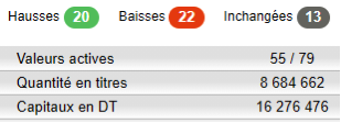Sur 55 panneaux actifs, 20 étaient à la hausse et 22 à la baisse et prés 16.3 MDT de transactions.