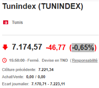 Le TUNINDEX cède 46.77 points, soit -0.65% à 7 221.34 pts.