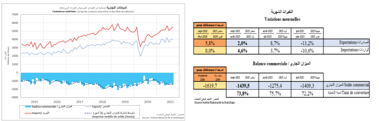 Selon la même source, le taux de couverture des échanges au mois de septembre 2021 a perdu 1,9 points par rapport à août 2021 pour s’établir à 73,8%.