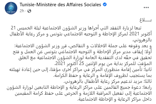 Suite à cette visite, le ministre des Affaires sociales, Malek Ezzahi a décidé de limoger le directeur du centre d’information et d’orientation sociales et d’ouvrir une enquête à son encontre. Cette décision a été prise, après avoir examiné les nombreux manquements et autres défectuosités