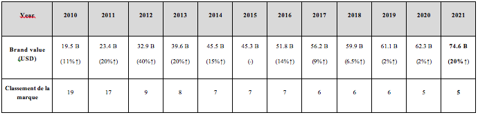 Croissance de la valeur de la marque Samsung Electronics