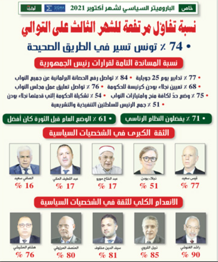 Quant au soutien du peuple des mesures exceptionnelles prises par le Président de la République, depuis le 25 juillet, le baromètre indique que 91% des personnes interrogées soutiennent les décisions de Kais Saied.