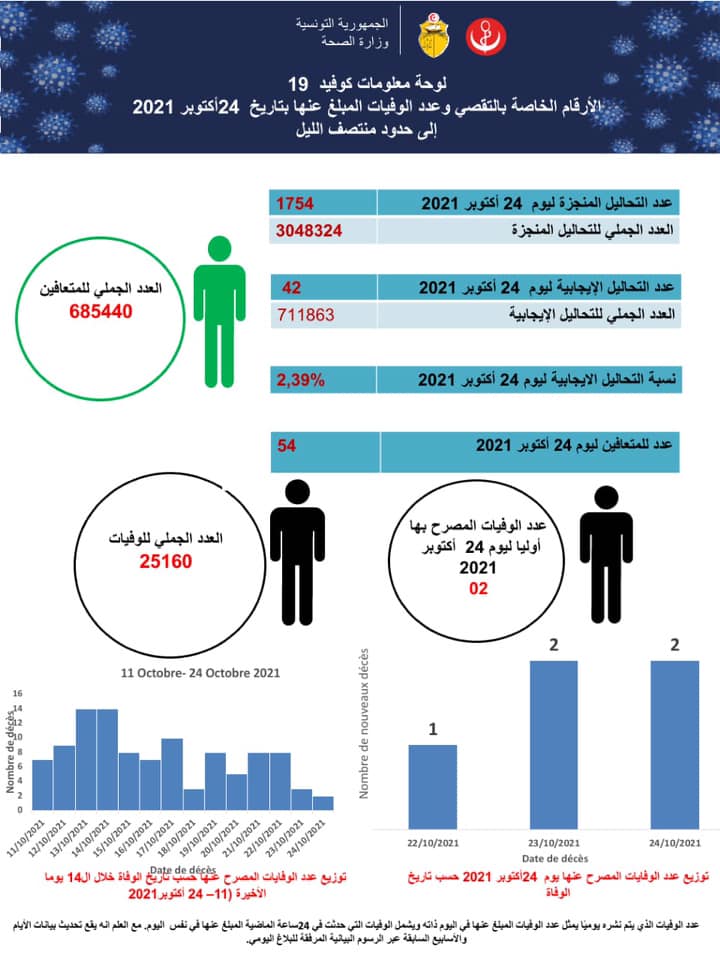 Dans un autre bilan publié le même jour, le ministère de la Santé a noté que 42 tests positifs ont été recensés, le 24 octobre, parmi 1754 tests portant, ainsi, le taux de positivité à 2.39%.