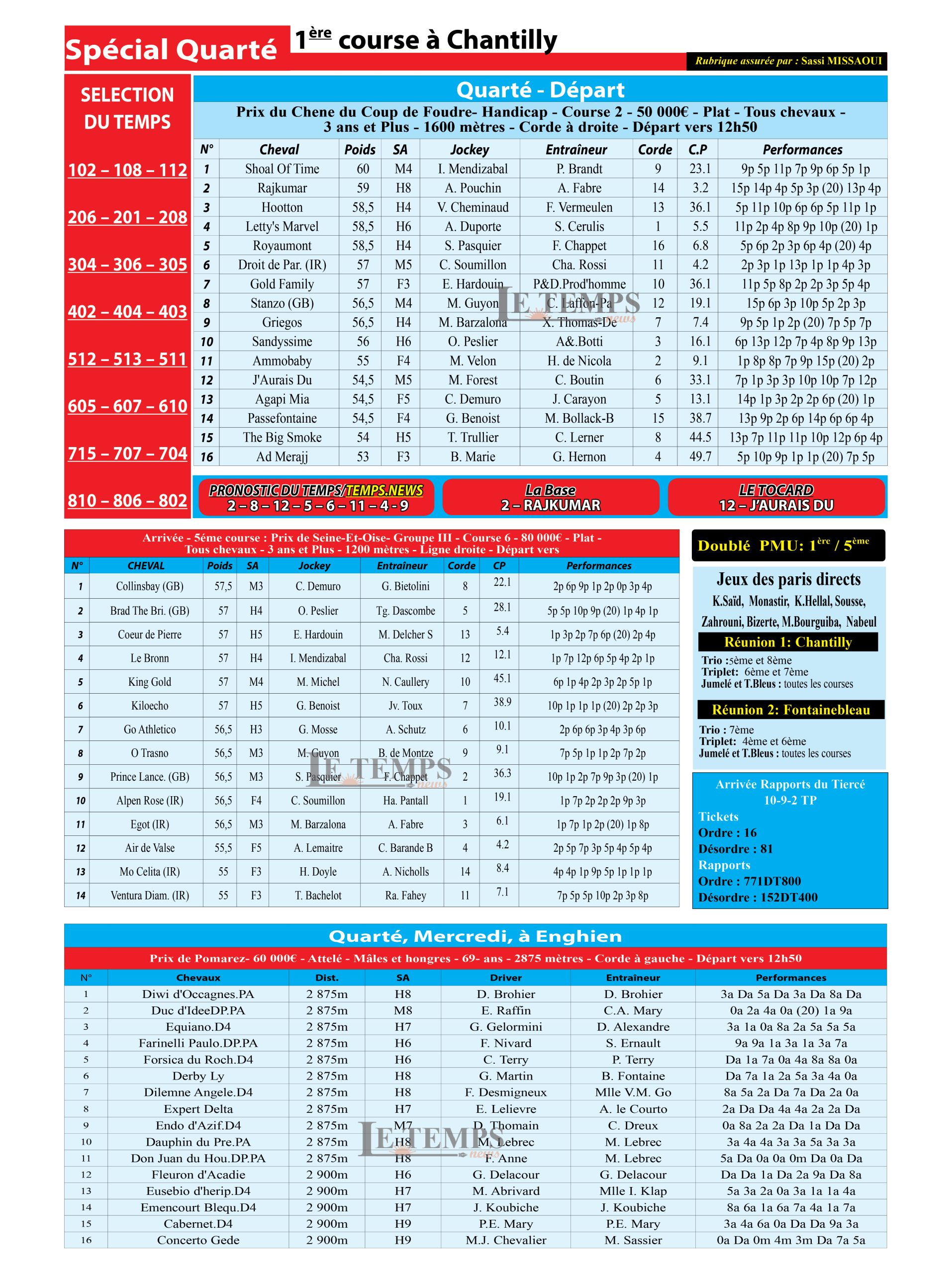 Partager Facebook Twitter LinkedIn Pinterest Email Notre spécial Quarté d’aujourd’hui, 1ère course à Chantilly, donne notre pronostic du Temps/ Temps.news avec le cheval n° 2 Rajkumar étant la base, tandis que le Tocard est le cheval n°12 J’aurais Du. ATS PMU Quarté Quinté Tiercé Turf