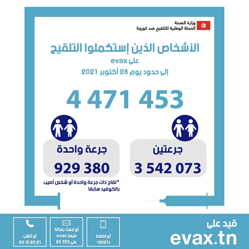 Plus de 4.4 millions des Tunisiens sont totalement vaccinés jusqu’à 28 octobre: moins de 3.6 millions ont reçu deux doses et 929380 ont reçu une seule dose à cause de la nature du vaccin ou car  ils ont été déjà affectés  par la pandémie, selon un communiqué rendu public.